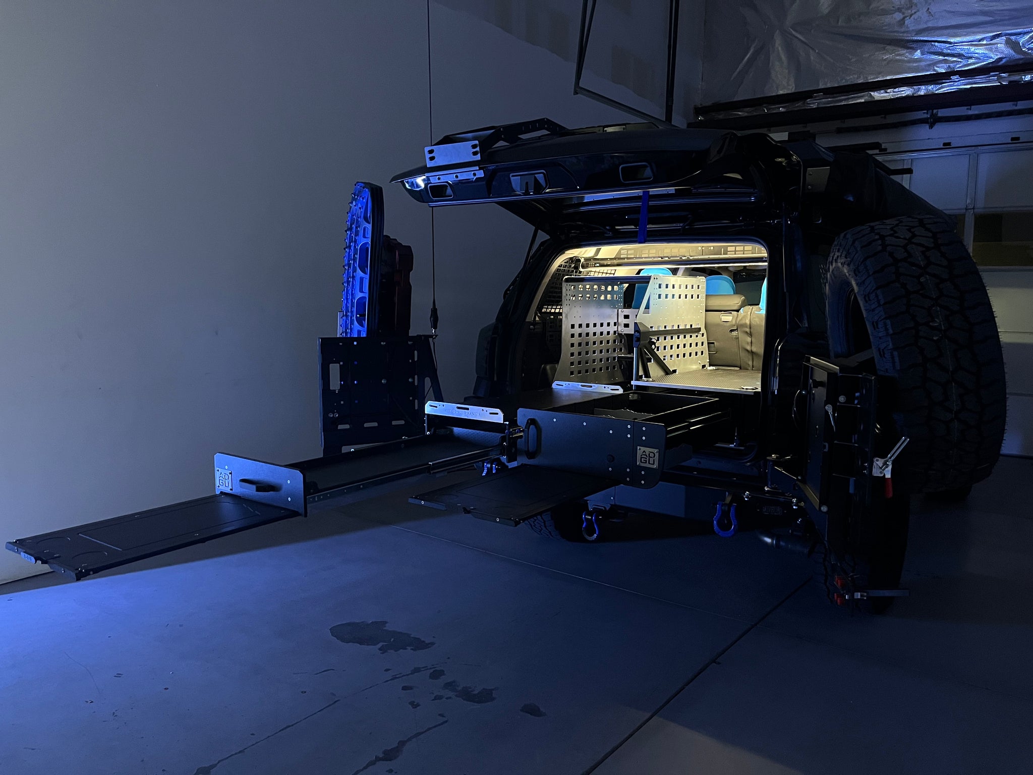 The rack also includes a configurable panel set for the vehicle forward end of the fridge to be used for mounting electronics or miscellaneous other gear.