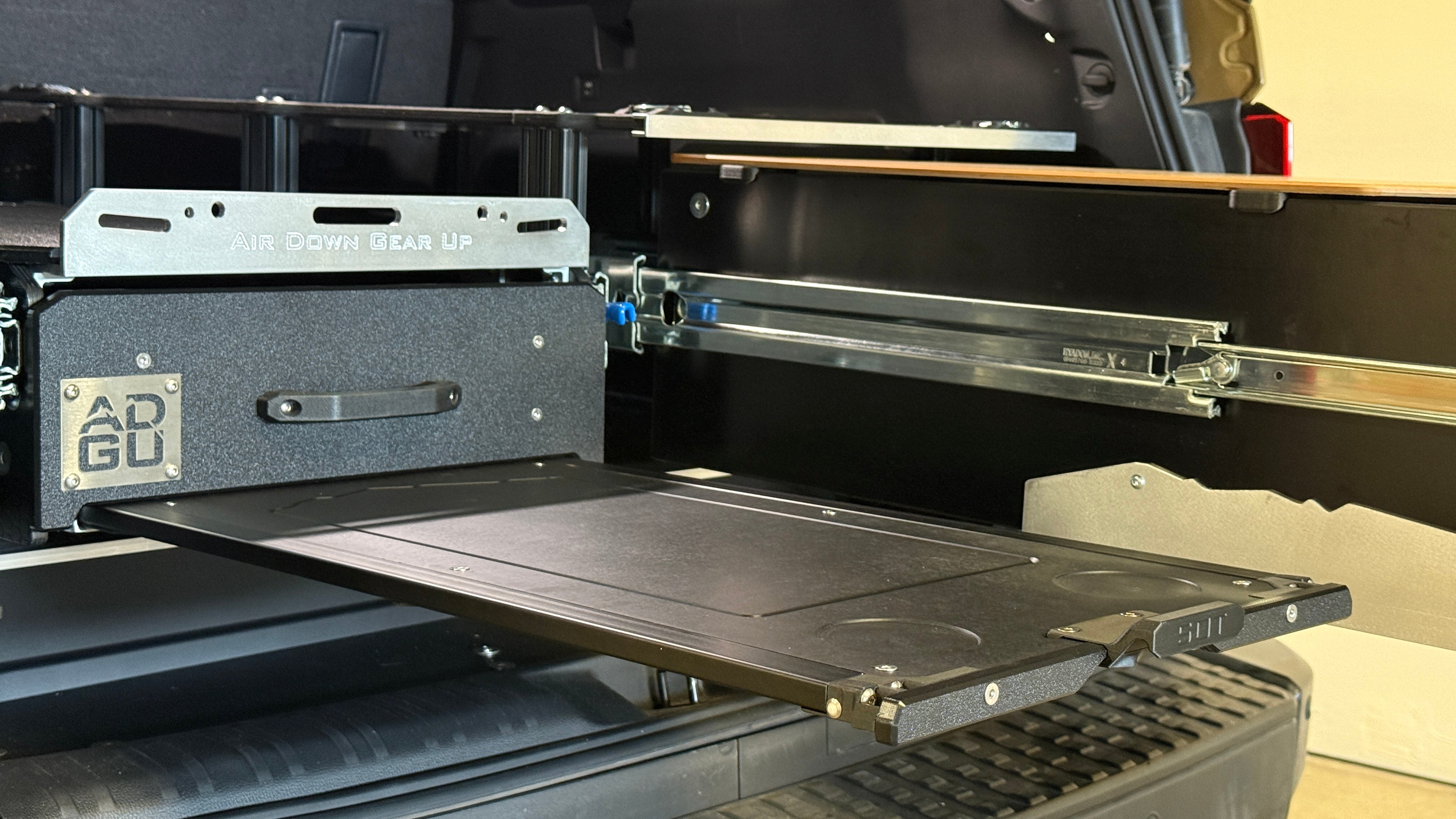 Stage 1 Fridge Slide: 36" travel locking slides with proprietary Air Down Gear Up stainless steel ball detents to hold the slides firmly in place when deployed. Mounting provisions are included with 1/4" aluminum rails front and back. The floor of this stage is made from textured HDPE and is impervious to liquids.